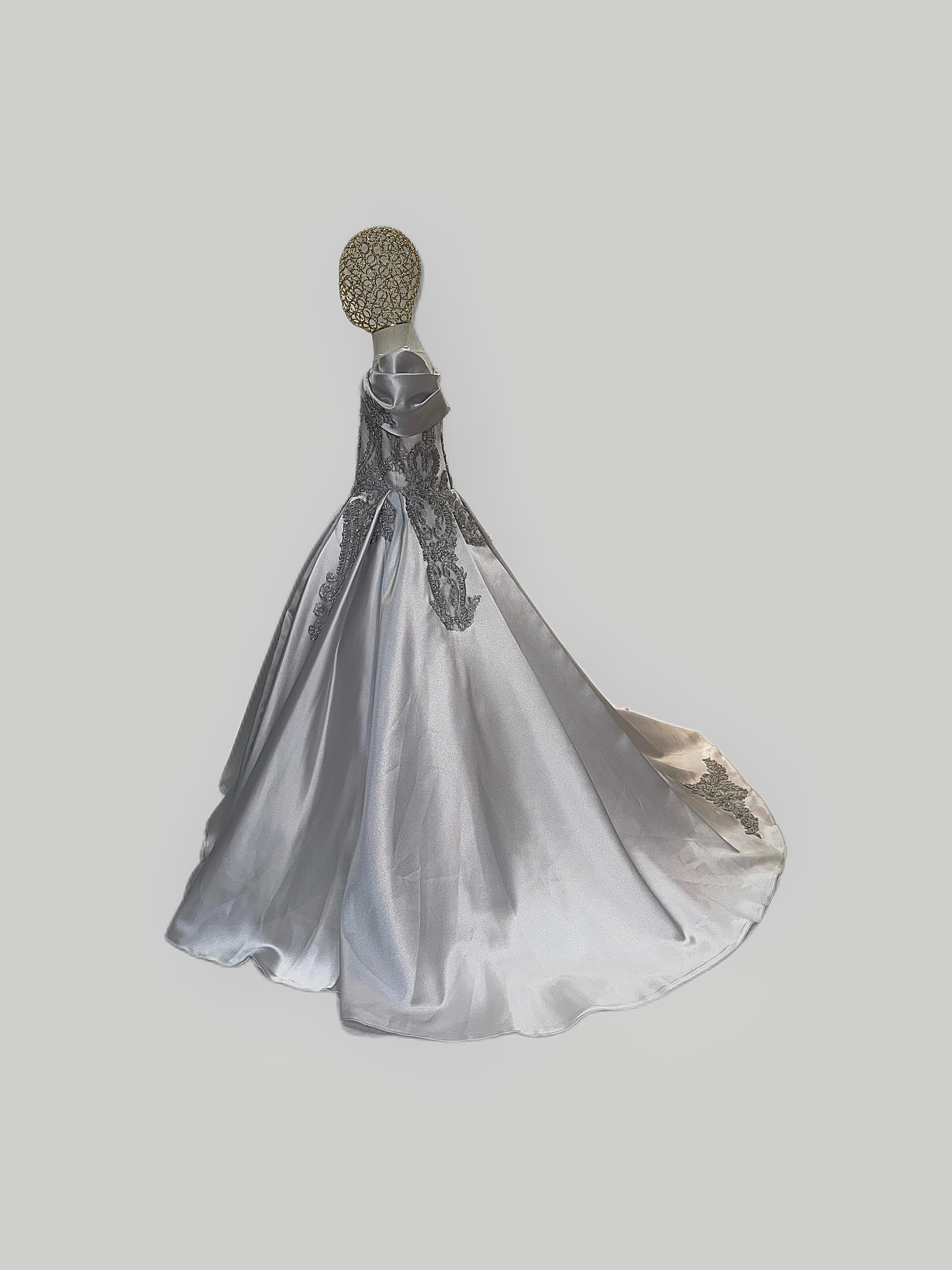 This stunning gown is crafted from luxurious, high-quality satin for a smooth, elegant finish that shines with every step. Designed with an inner hoop skirt (ring) to create a beautifully full, puffed-out silhouette, it offers a classic princess look with modern grace.