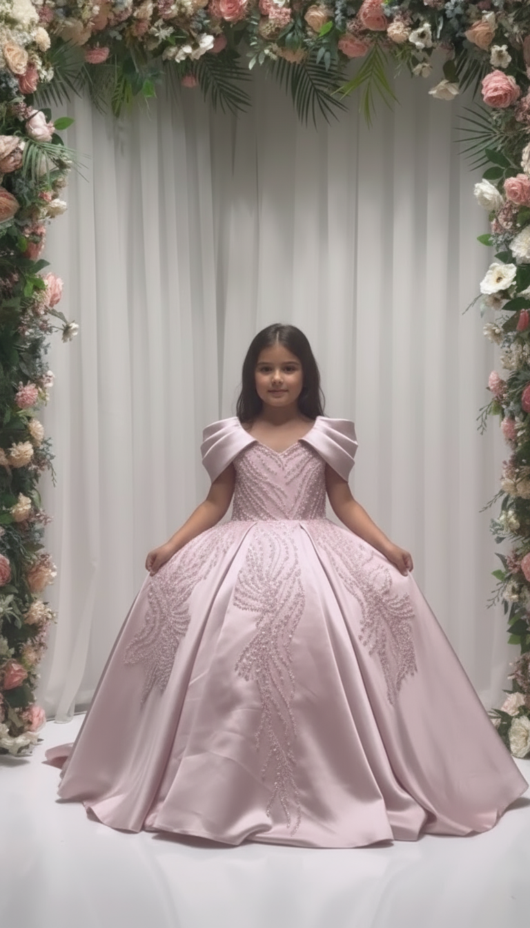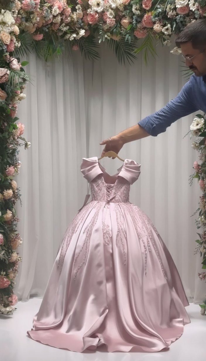 This stunning gown is crafted from luxurious, high-quality satin for a smooth, elegant finish that shines with every step. Designed with an inner hoop skirt (ring) to create a beautifully full, puffed-out silhouette, it offers a classic princess look with modern grace.