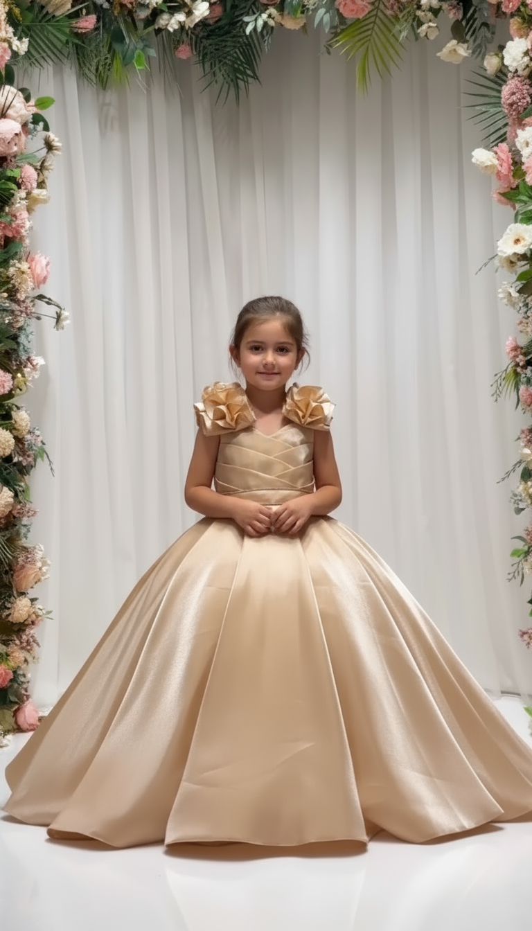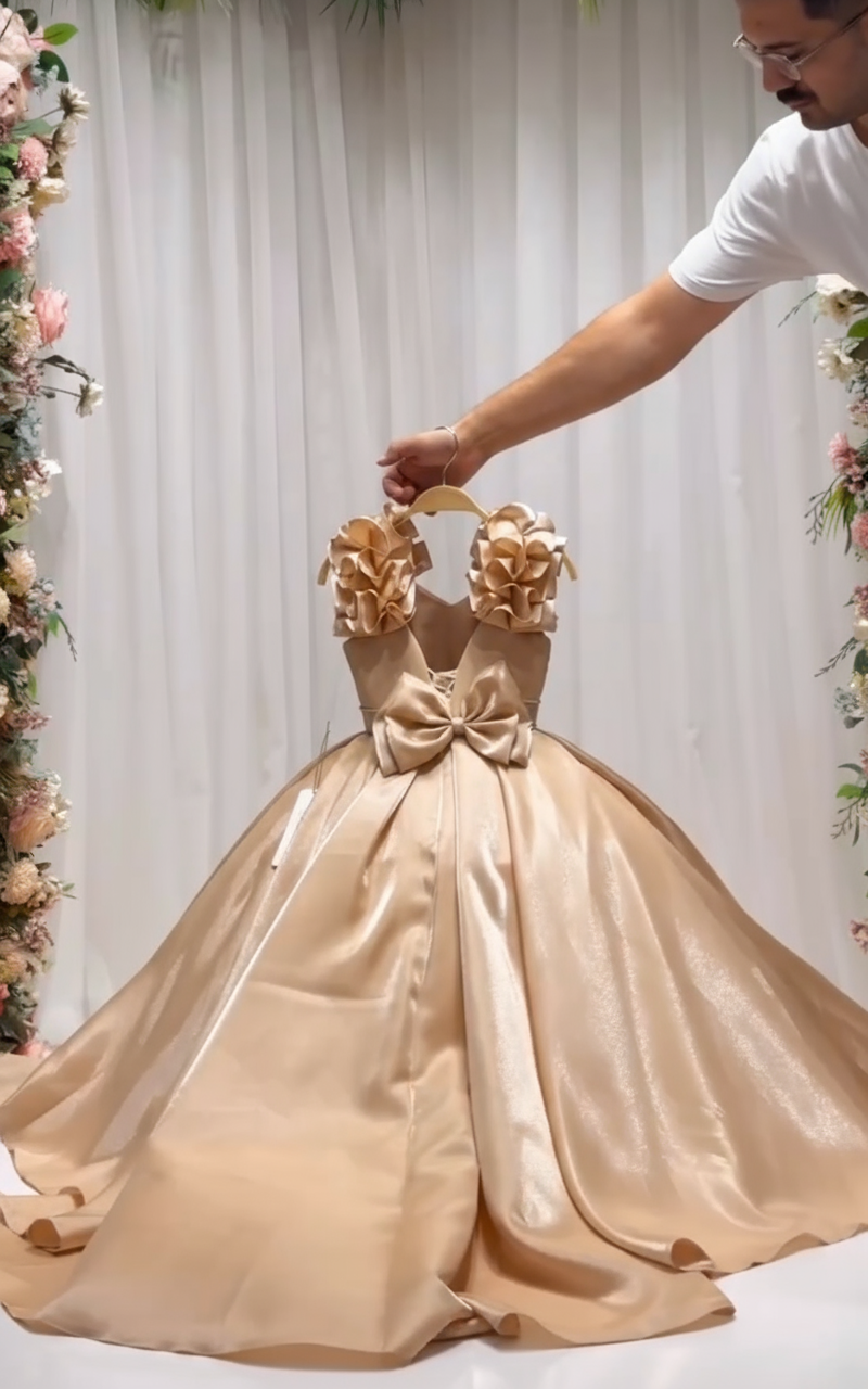 This stunning gown is crafted from luxurious, high-quality satin for a smooth, elegant finish that shines with every step. Designed with an inner hoop skirt (ring) to create a beautifully full, puffed-out silhouette, it offers a classic princess look with modern grace.