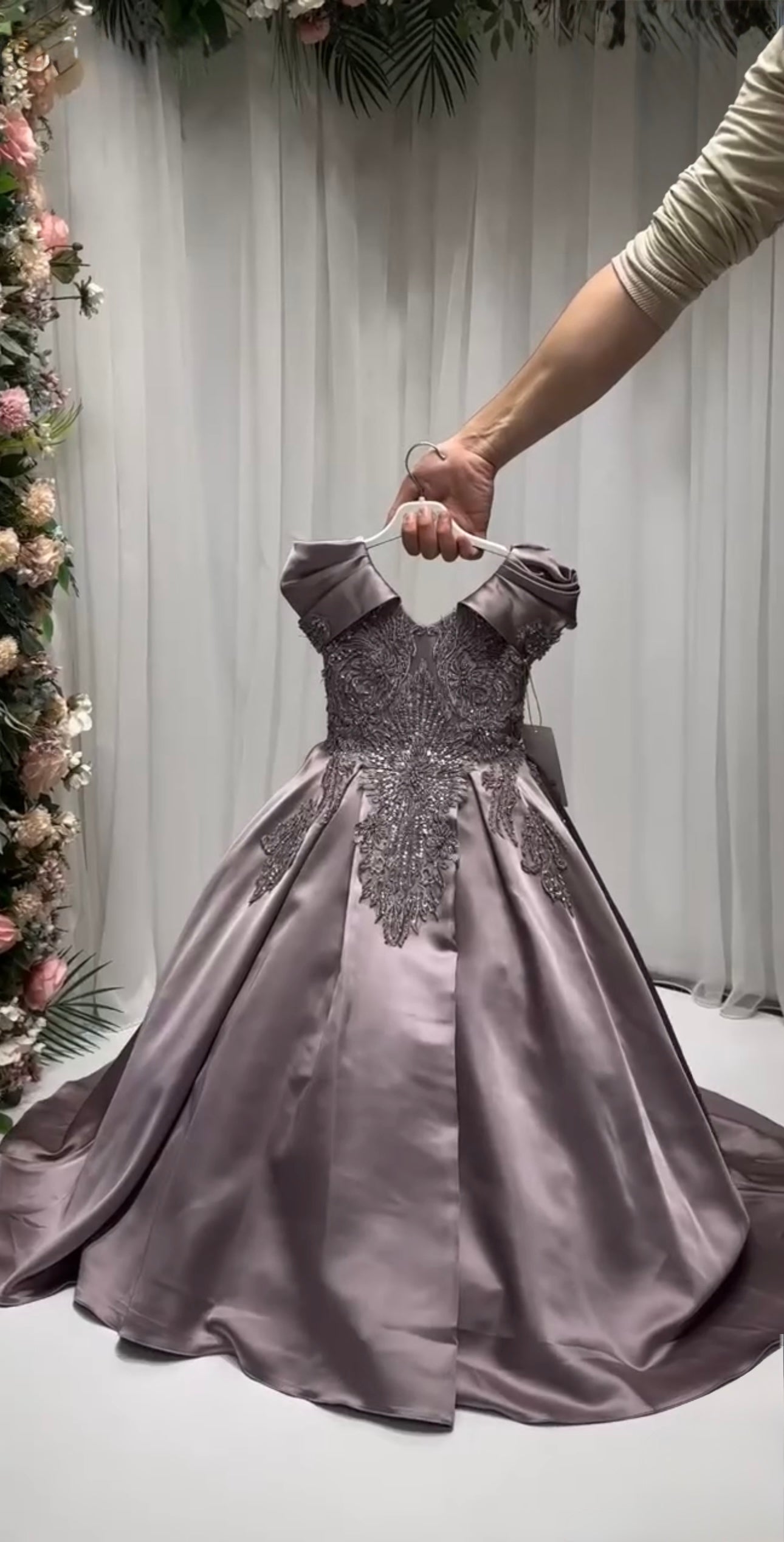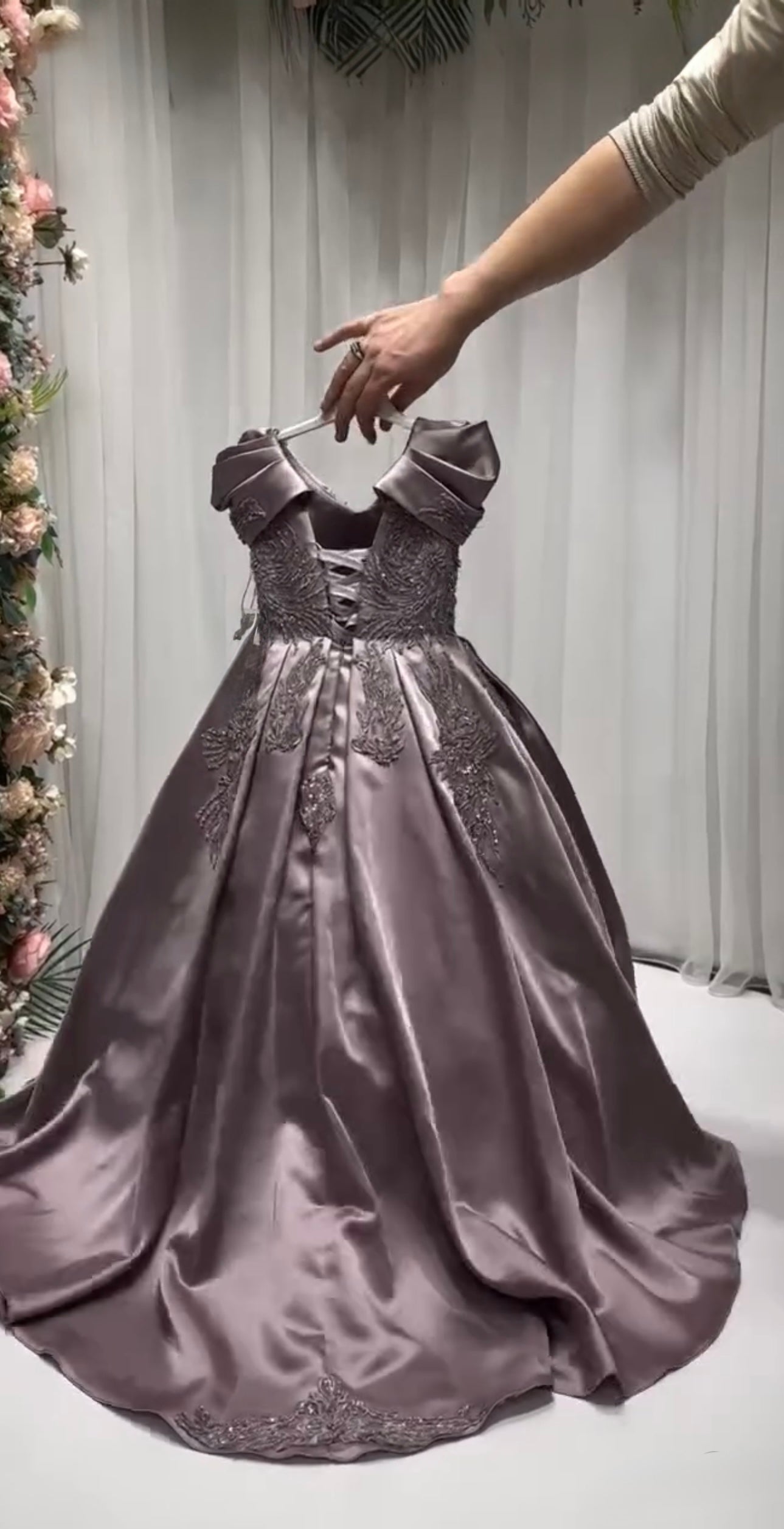 This stunning gown is crafted from luxurious, high-quality satin for a smooth, elegant finish that shines with every step. Designed with an inner hoop skirt (ring) to create a beautifully full, puffed-out silhouette, it offers a classic princess look with modern grace.