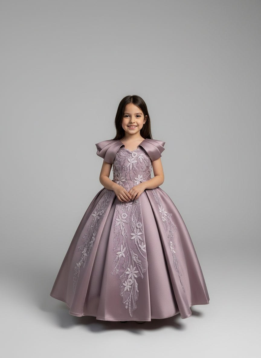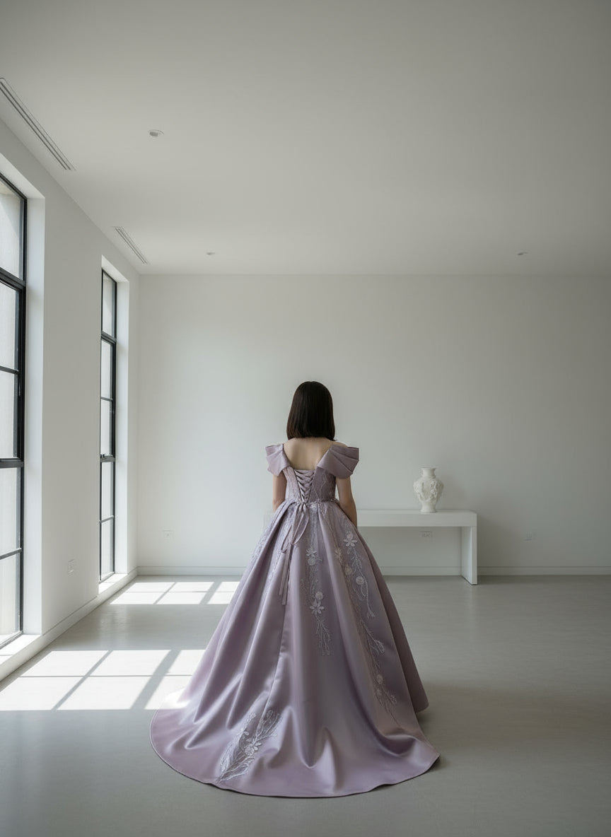 This stunning gown is crafted from luxurious, high-quality satin for a smooth, elegant finish that shines with every step. Designed with an inner hoop skirt (ring) to create a beautifully full, puffed-out silhouette, it offers a classic princess look with modern grace.