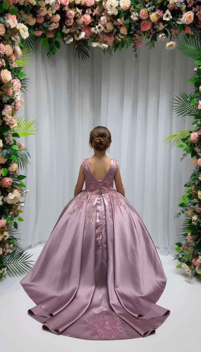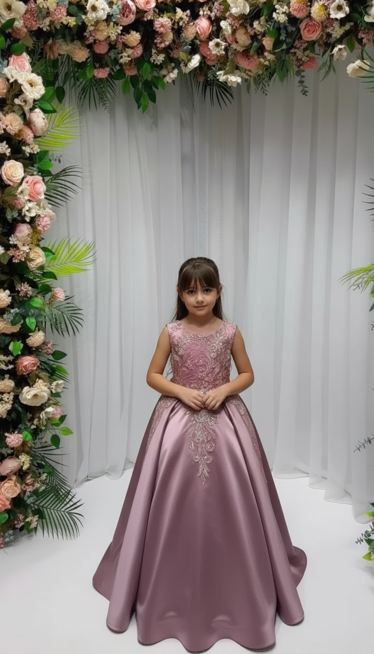 This stunning gown is crafted from luxurious, high-quality satin for a smooth, elegant finish that shines with every step. Designed with an inner hoop skirt (ring) to create a beautifully full, puffed-out silhouette, it offers a classic princess look with modern grace.