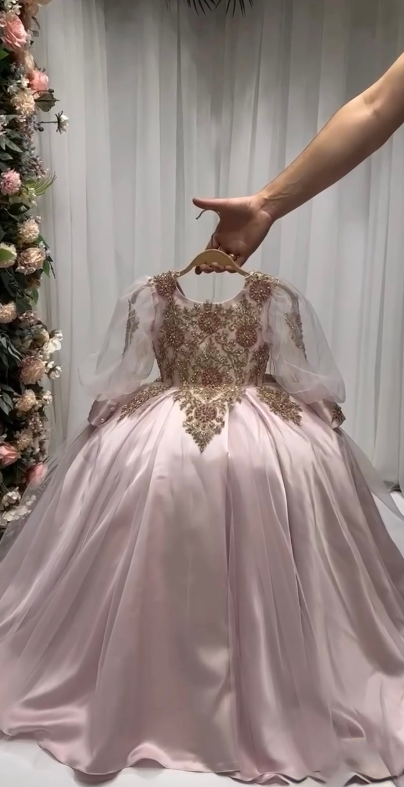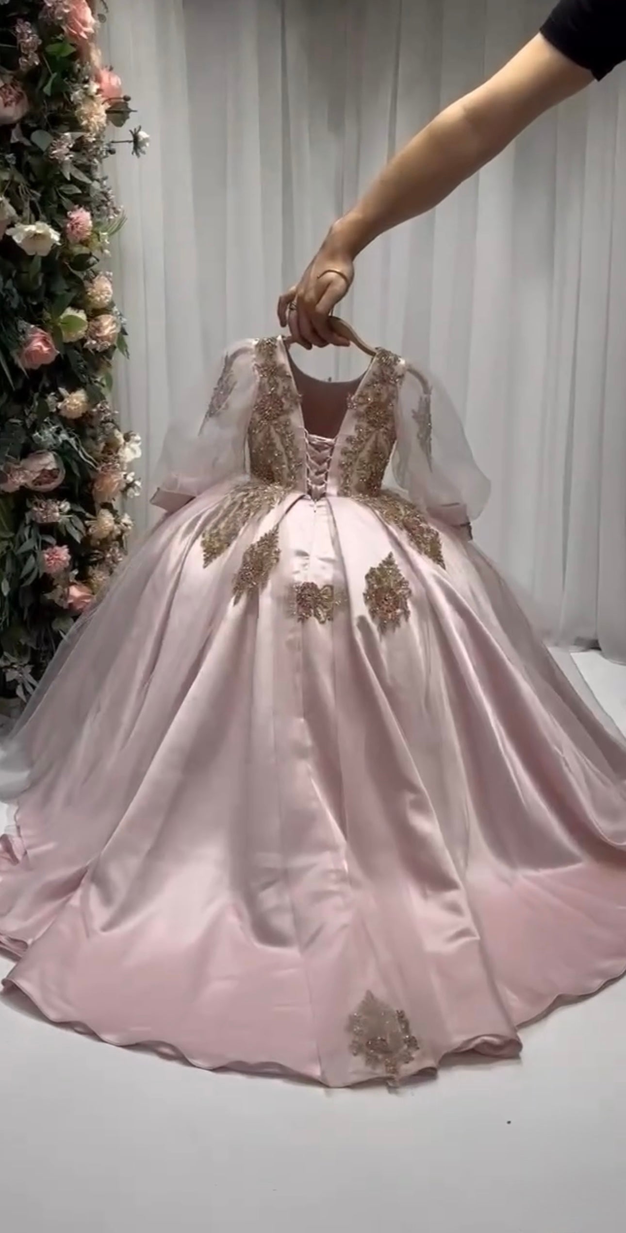 This stunning gown is crafted from luxurious, high-quality satin for a smooth, elegant finish that shines with every step. Designed with an inner hoop skirt (ring) to create a beautifully full, puffed-out silhouette, it offers a classic princess look with modern grace.