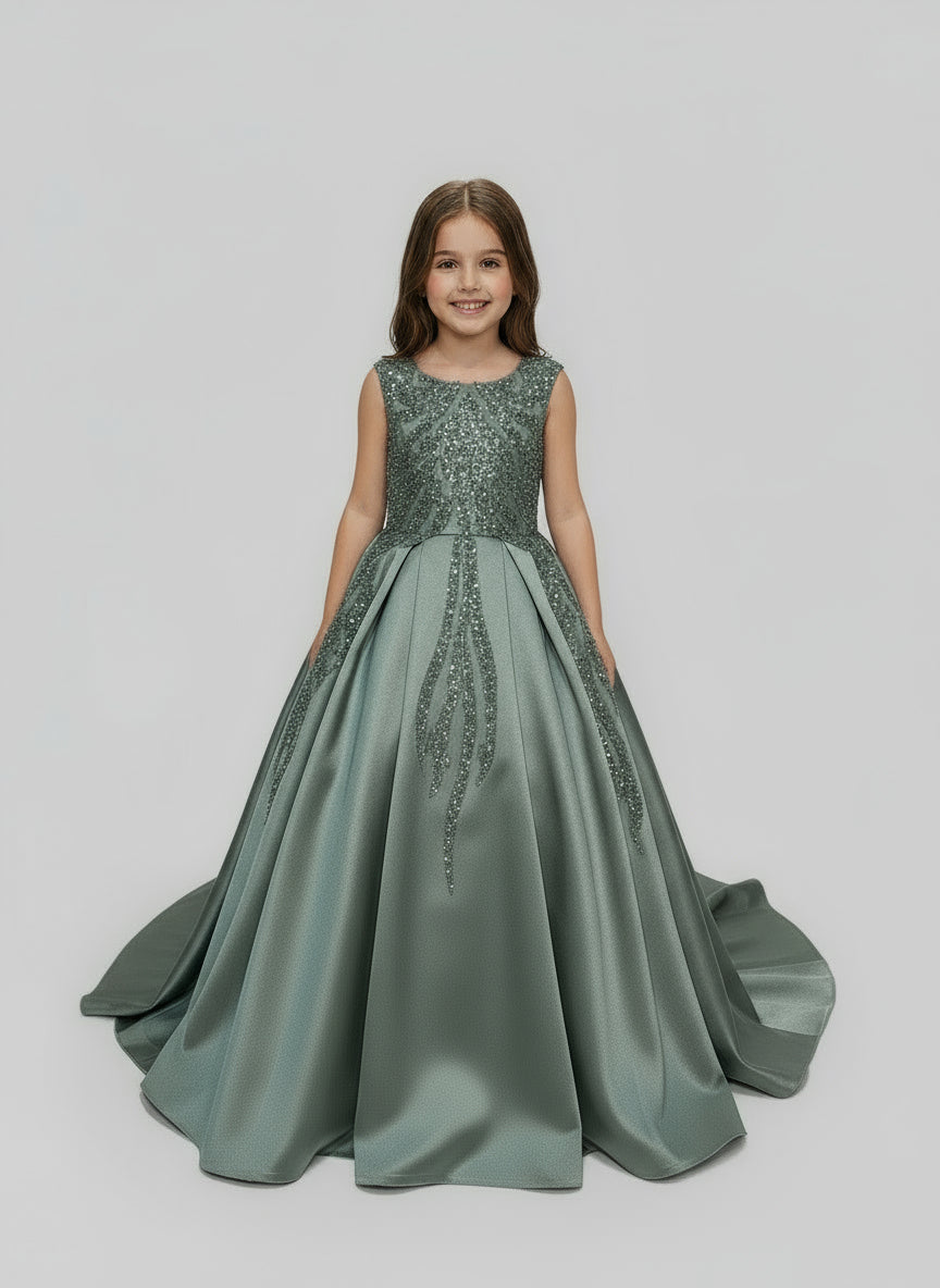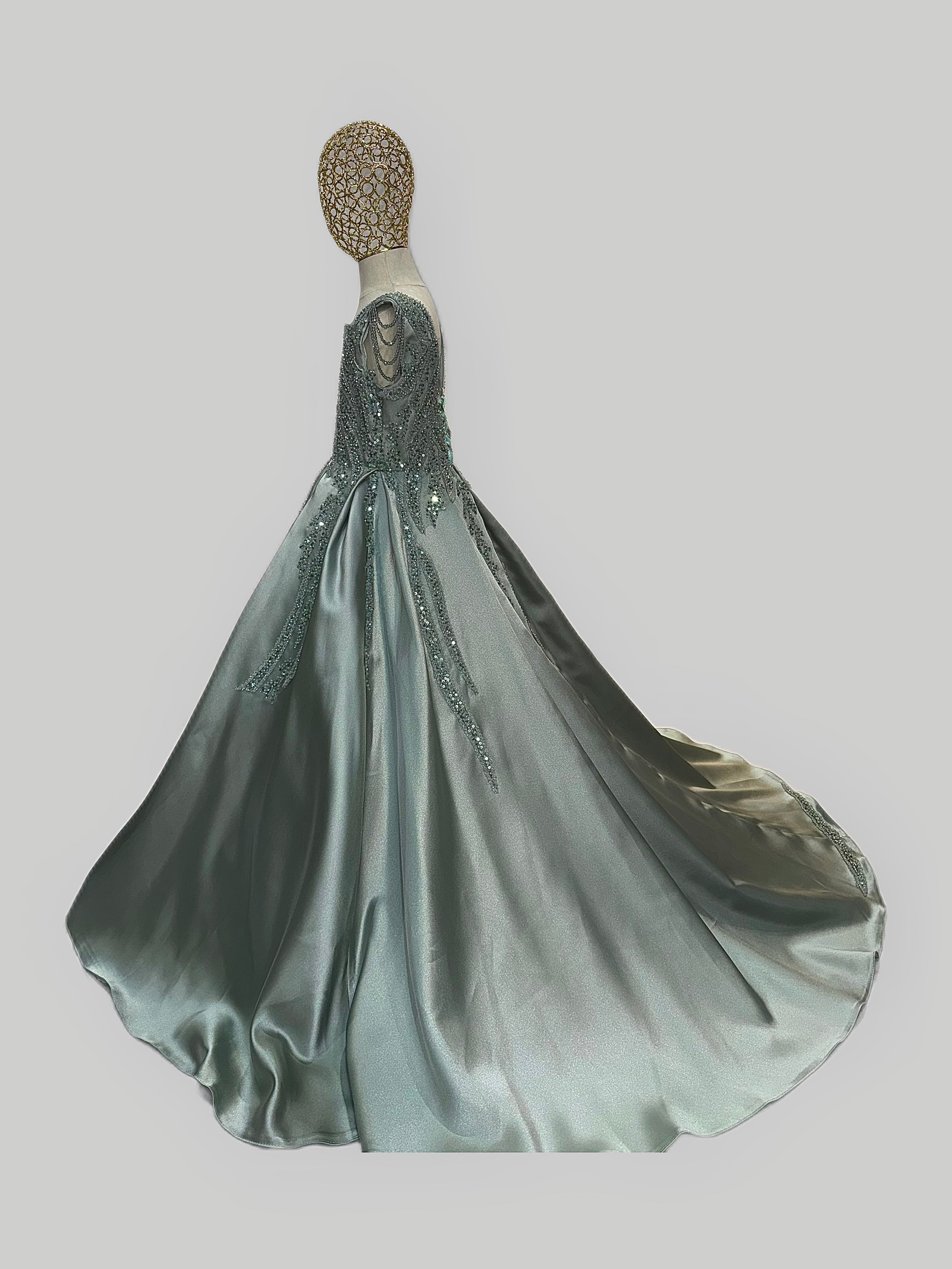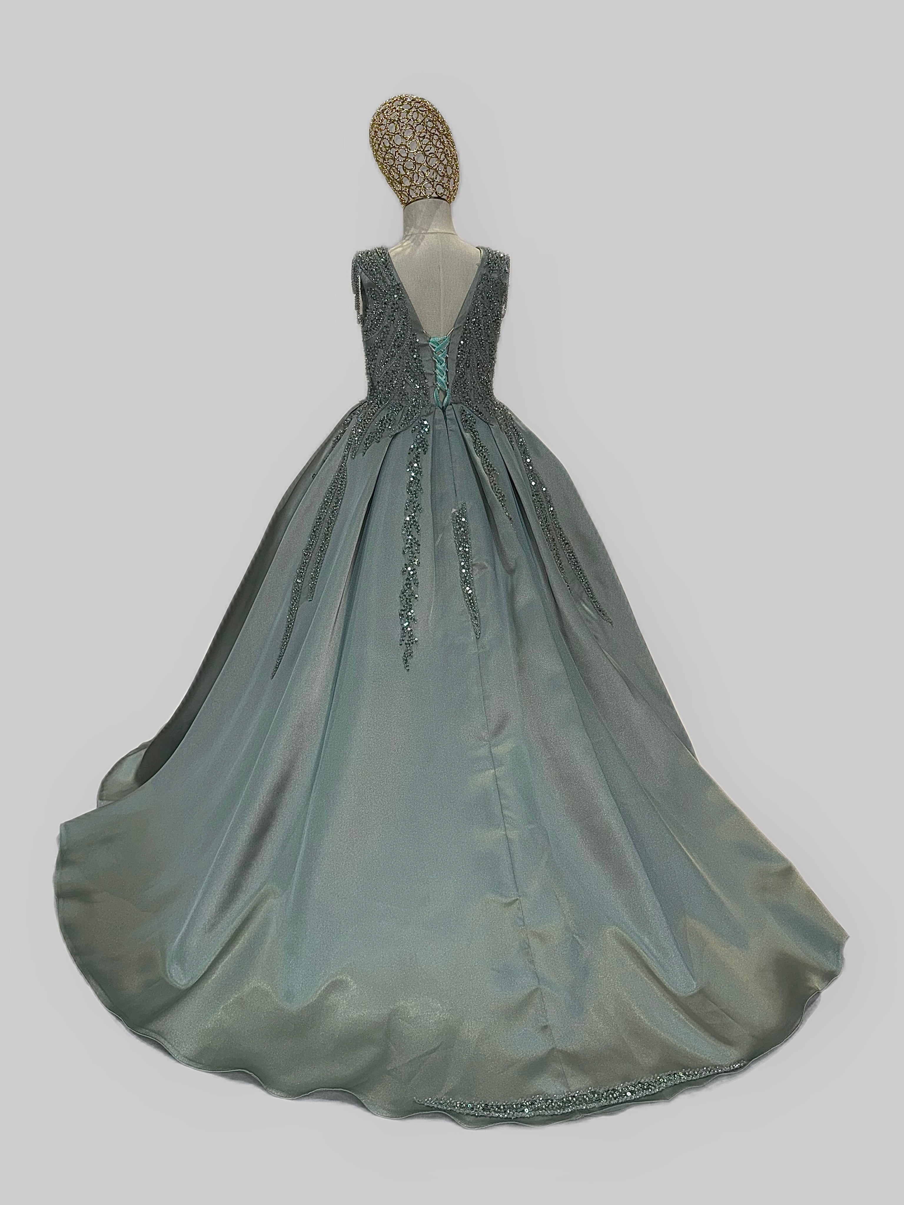This stunning gown is crafted from luxurious, high-quality satin for a smooth, elegant finish that shines with every step. Designed with an inner hoop skirt (ring) to create a beautifully full, puffed-out silhouette, it offers a classic princess look with modern grace.