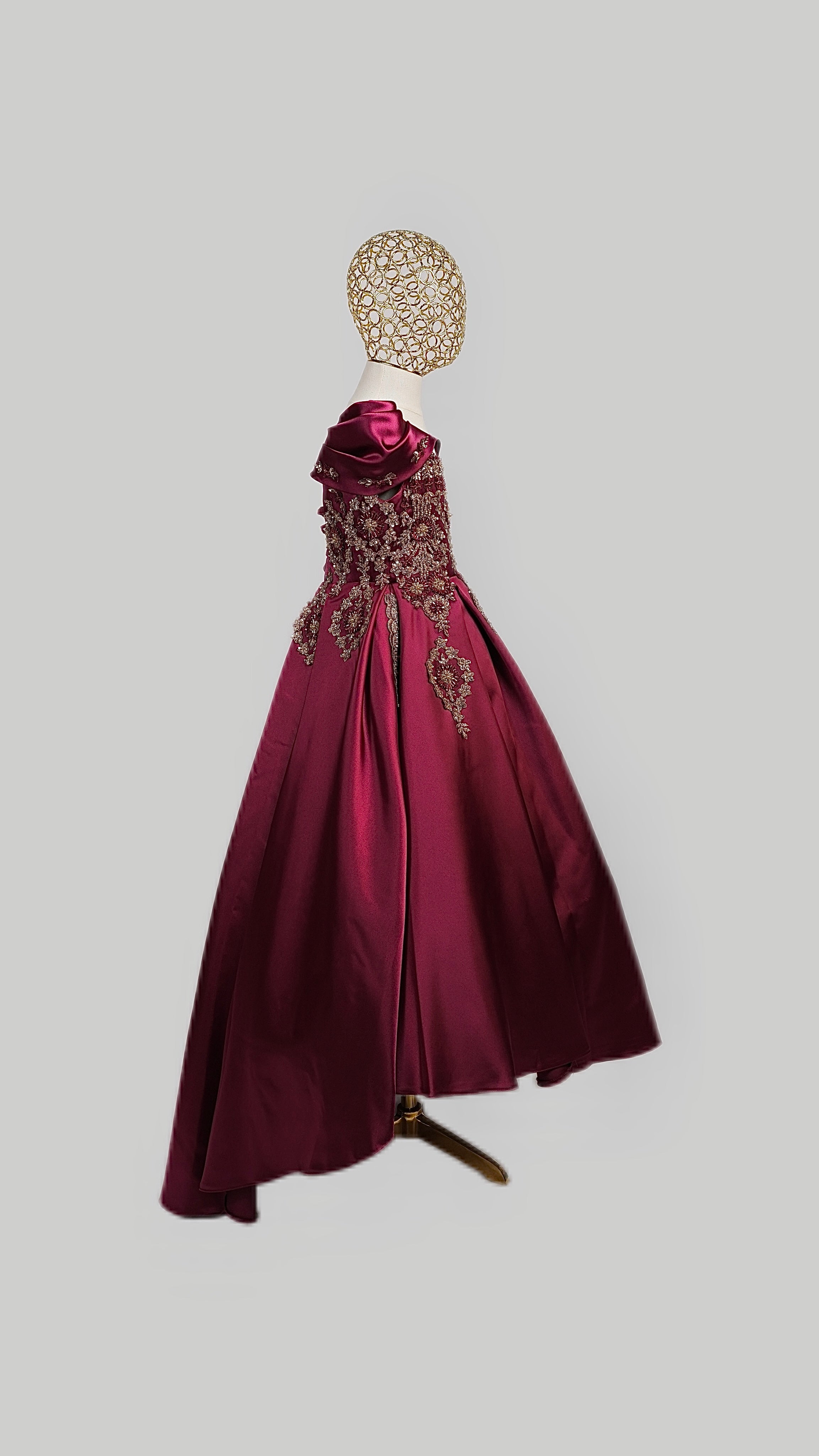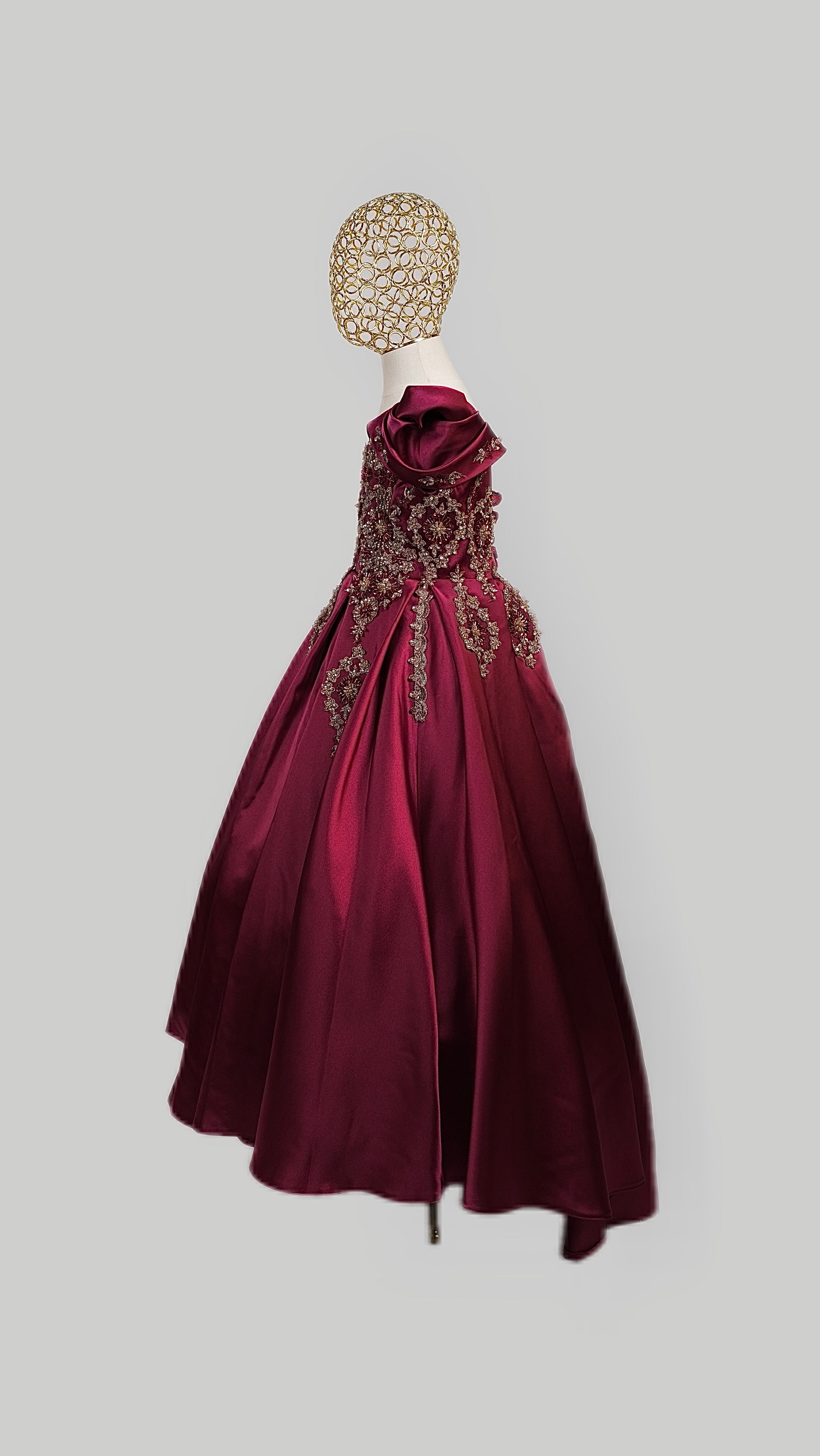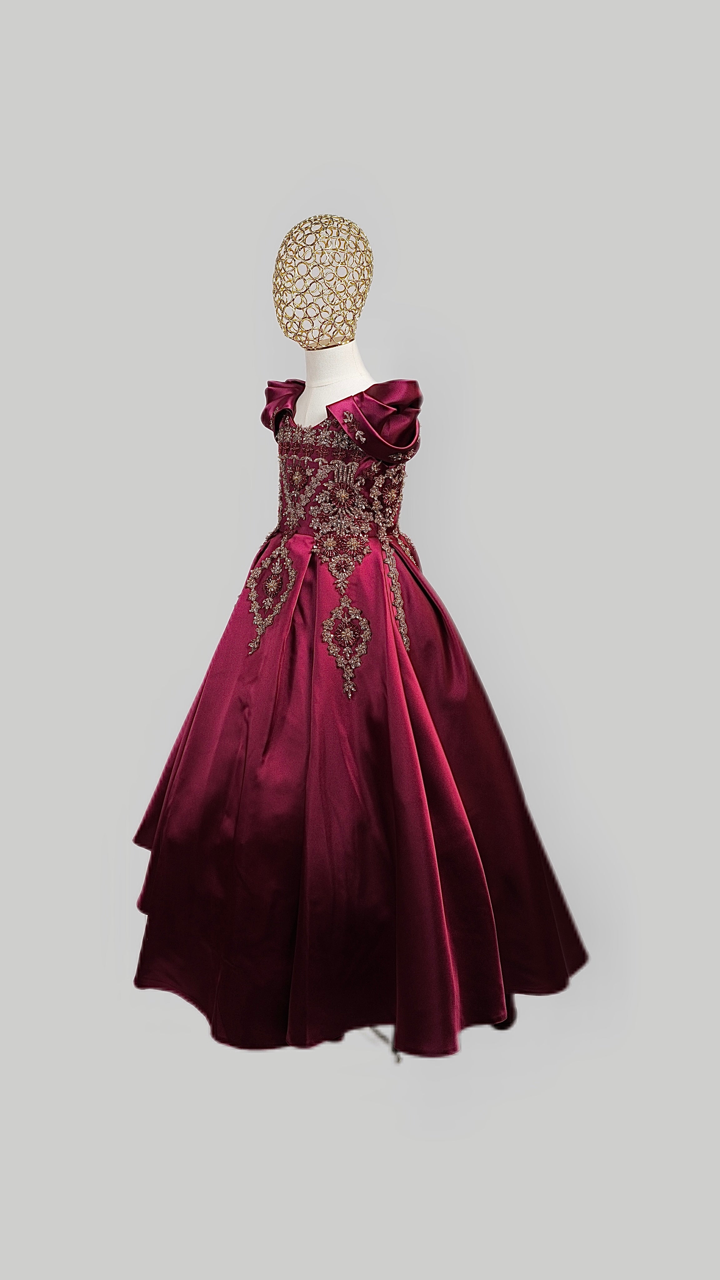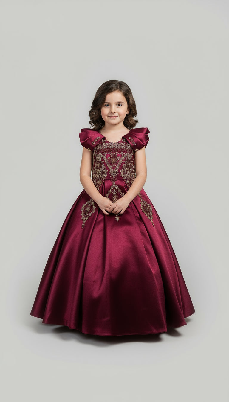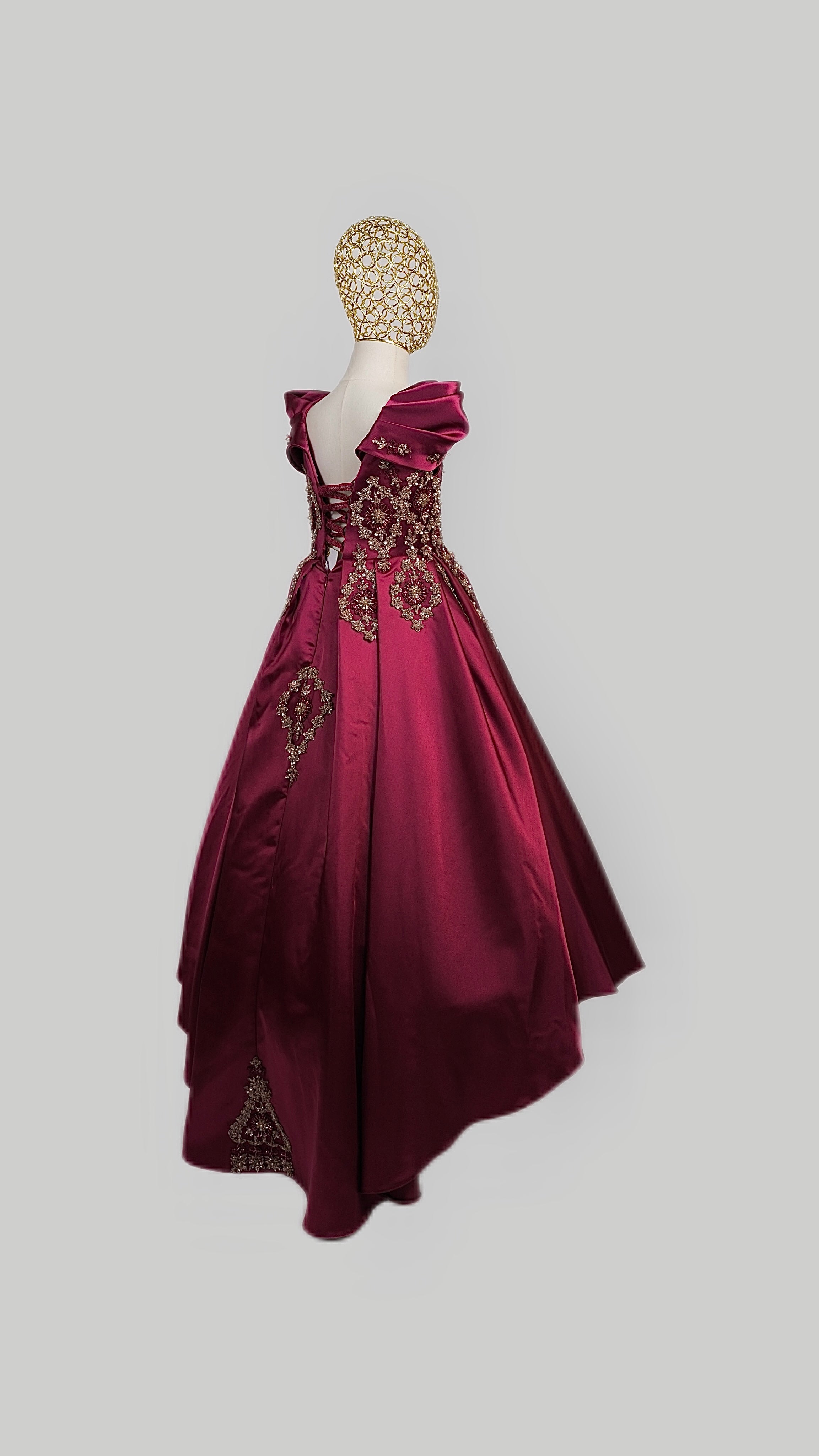 This stunning gown is crafted from luxurious, high-quality satin for a smooth, elegant finish that shines with every step. Designed with an inner hoop skirt (ring) to create a beautifully full, puffed-out silhouette, it offers a classic princess look with modern grace.